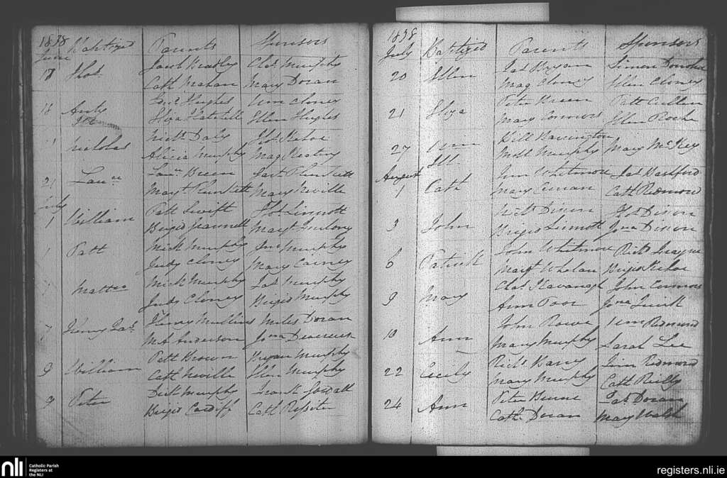 Castlebridge; County of Wexford; Diocese of Ferns. Baptisms, June 1838 to Aug. 1838