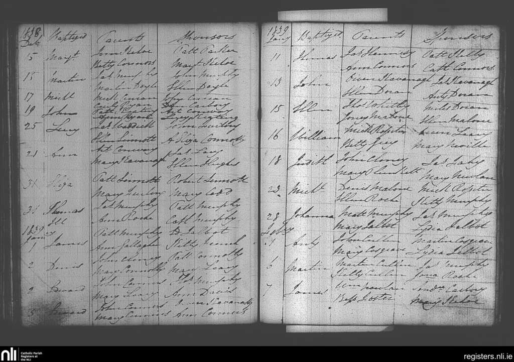 Castlebridge; County of Wexford; Diocese of Ferns. Baptisms, Dec. 1838 to Feb. 1839