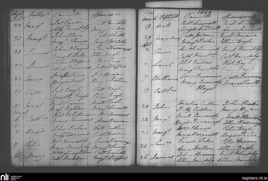 Castlebridge; County of Wexford; Diocese of Ferns. Baptisms, Feb. 1840 to Apr. 1840