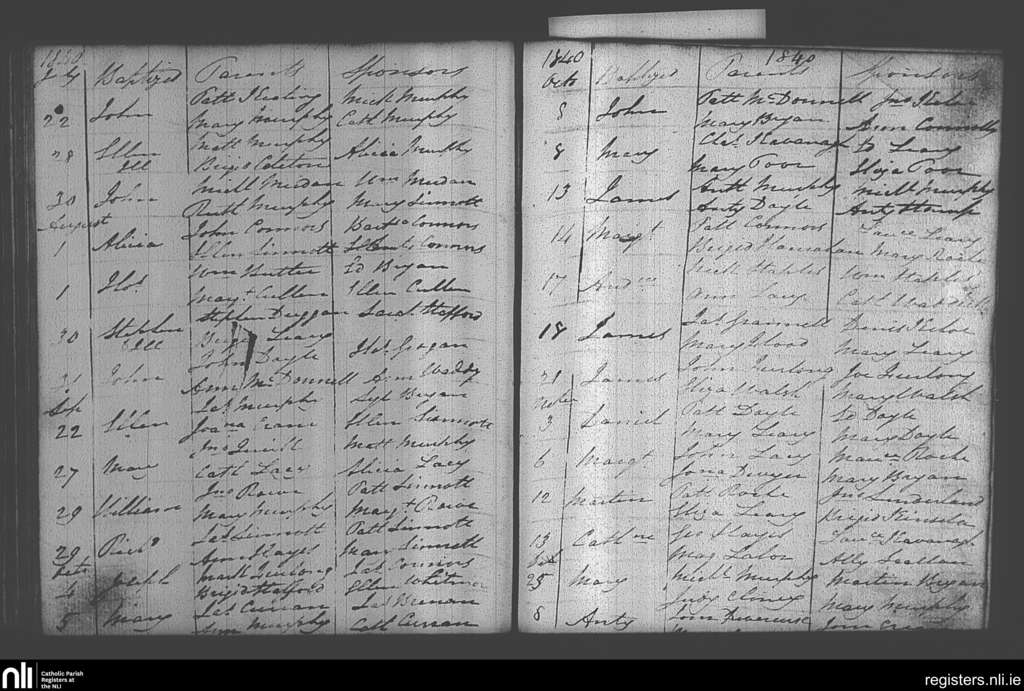 Castlebridge; County of Wexford; Diocese of Ferns. Baptisms, July 1840 to Dec. 1840