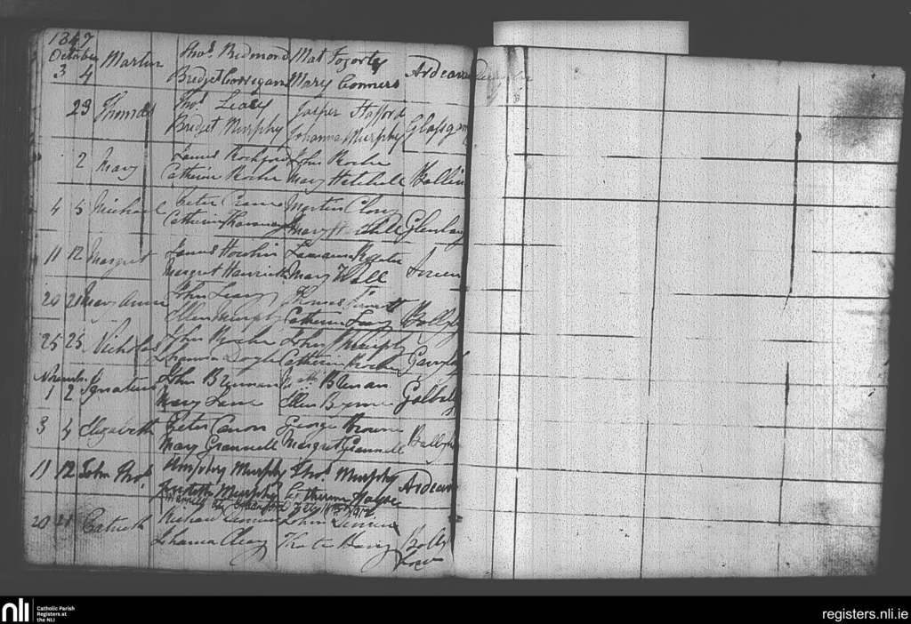 Castlebridge; County of Wexford; Diocese of Ferns. Baptisms, Oct. 1857 to Nov. 1857