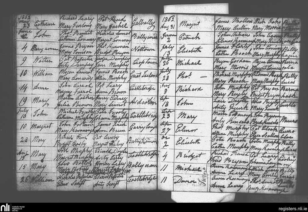 Castlebridge; County of Wexford; Diocese of Ferns. Baptisms, May 1862 to Oct. 1862
