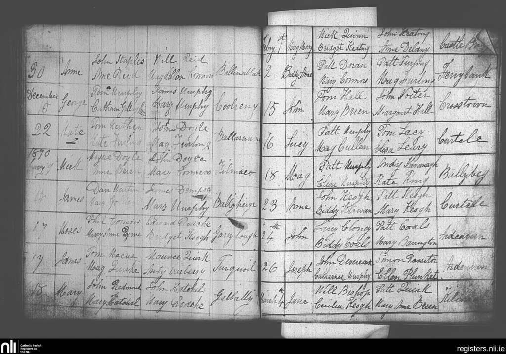 Castlebridge; County of Wexford; Diocese of Ferns. Baptisms, Nov. 1869 to Mar. 1870