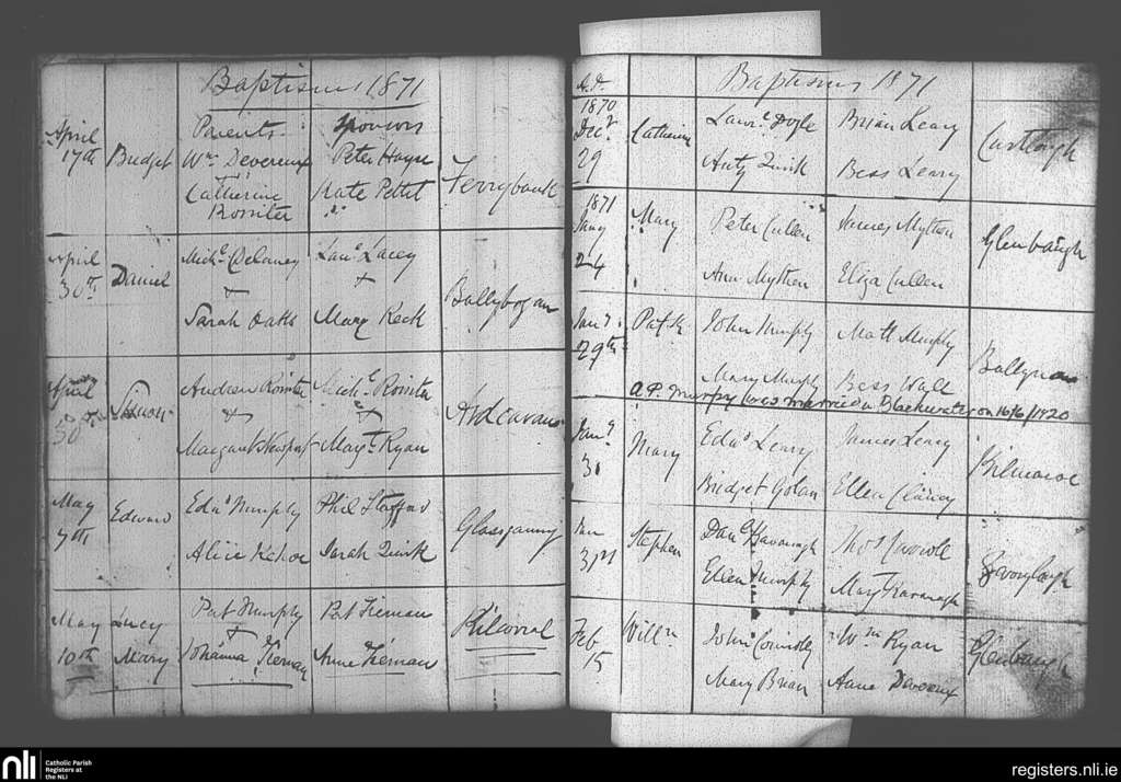 Castlebridge; County of Wexford; Diocese of Ferns. Baptisms, Dec. 1870 to May 1871