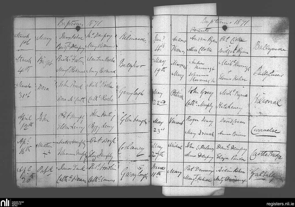 Castlebridge; County of Wexford; Diocese of Ferns. Baptisms, Jan. 1871 to June 1871