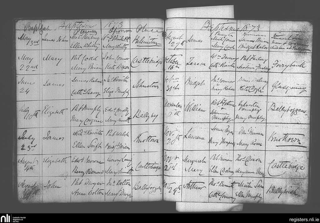 Castlebridge; County of Wexford; Diocese of Ferns. Baptisms, May 1873 to Nov. 1873