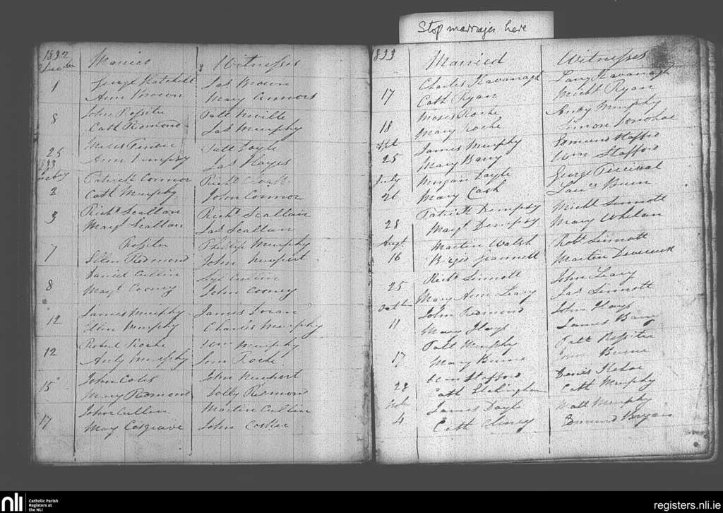 Castlebridge; County of Wexford; Diocese of Ferns. Marriages, Dec. 1832 to Nov. 1833