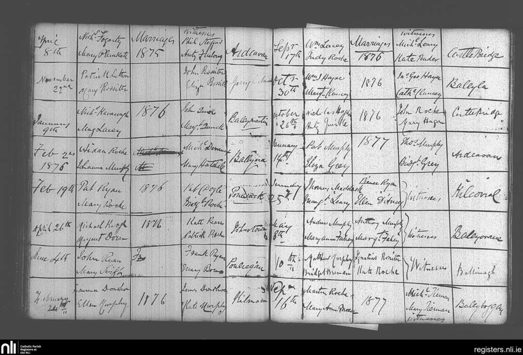 Castlebridge; County of Wexford; Diocese of Ferns. Marriages, Apr. 1875 to Sep. 1877