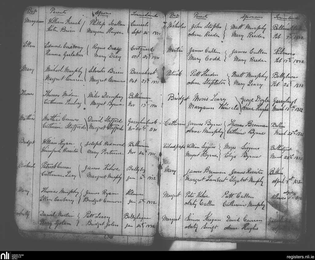 Castlebridge; County of Wexford; Diocese of Ferns. Baptisms, Sep. 1871 to Apr. 1872