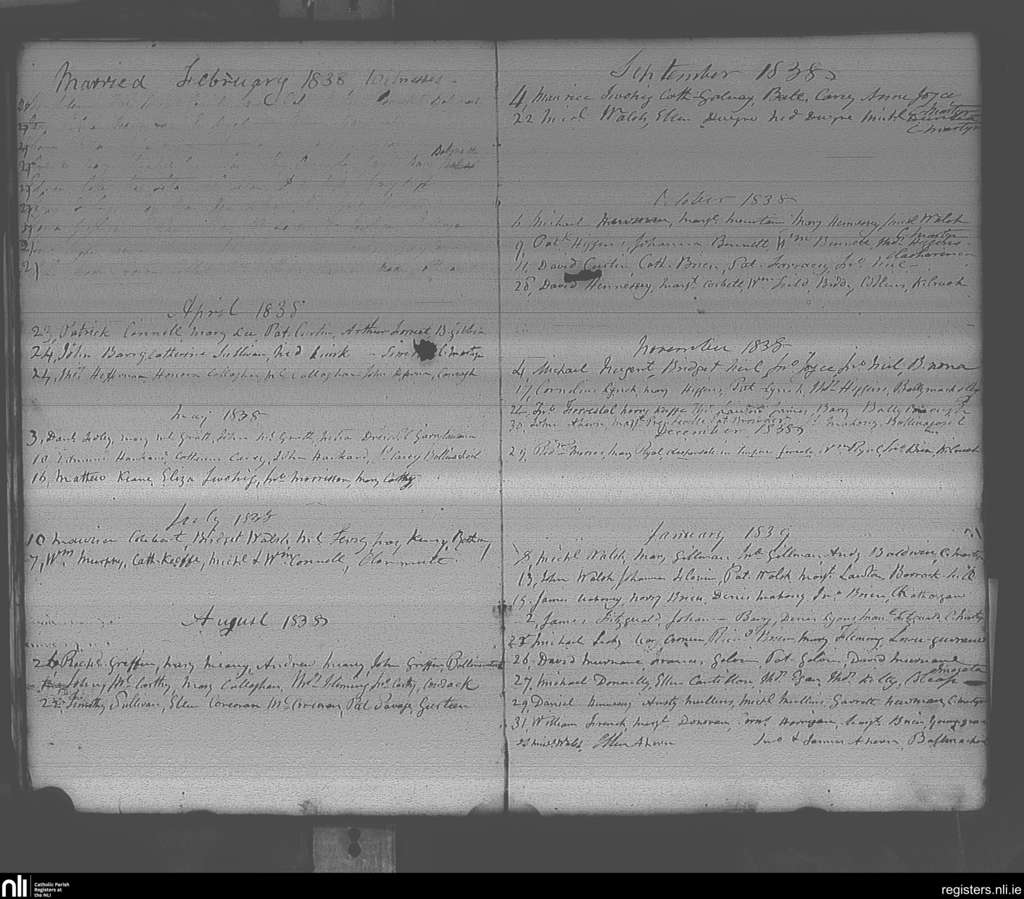 Imogeela; County of Cork; Diocese of Cloyne. Marriages, Feb. 1838 to Jan. 1839