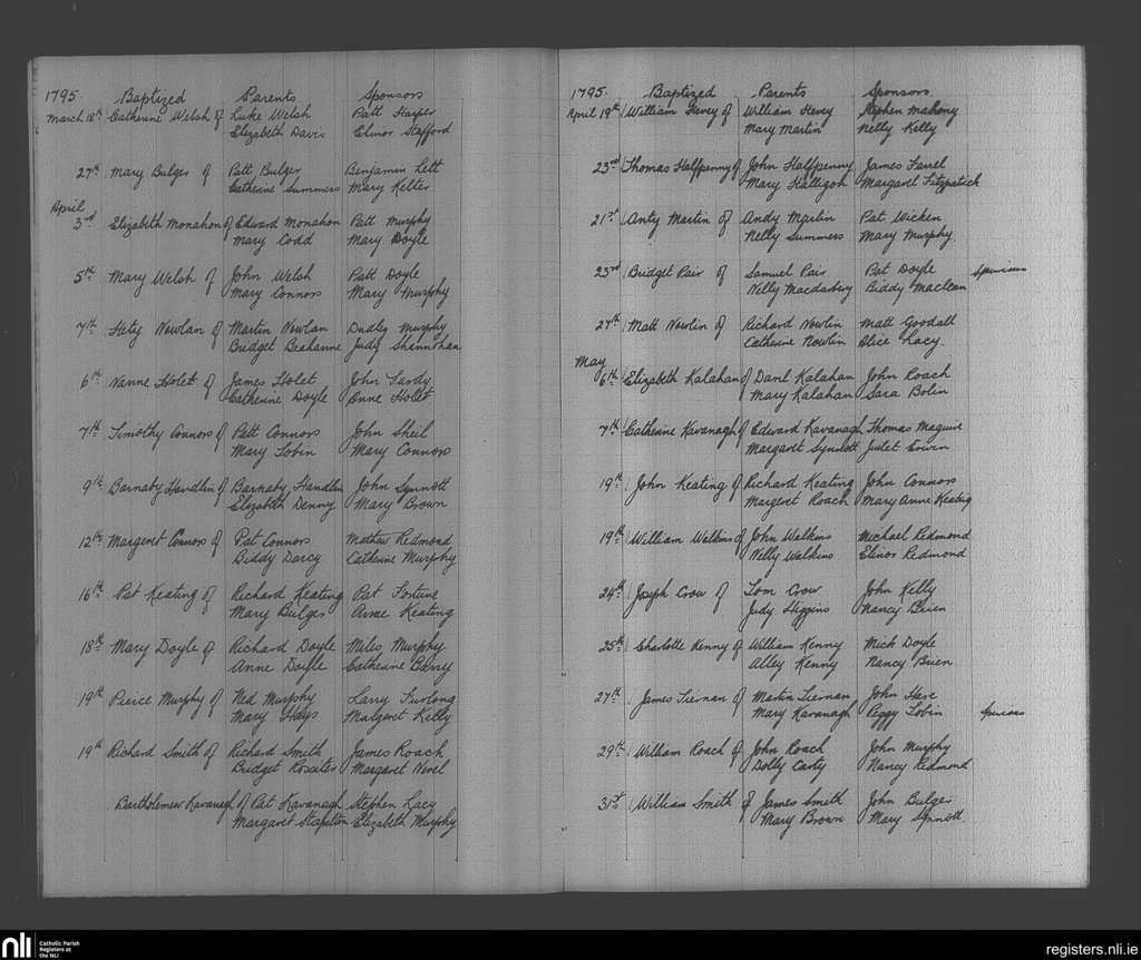 Enniscorthy; County of Wexford; Diocese of Ferns. Baptisms, Mar. 1795 to May 1795