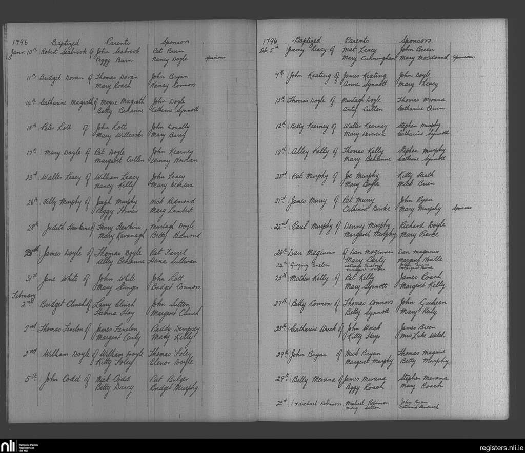 Enniscorthy; County of Wexford; Diocese of Ferns. Baptisms, Jan. 1796 to Feb. 1796