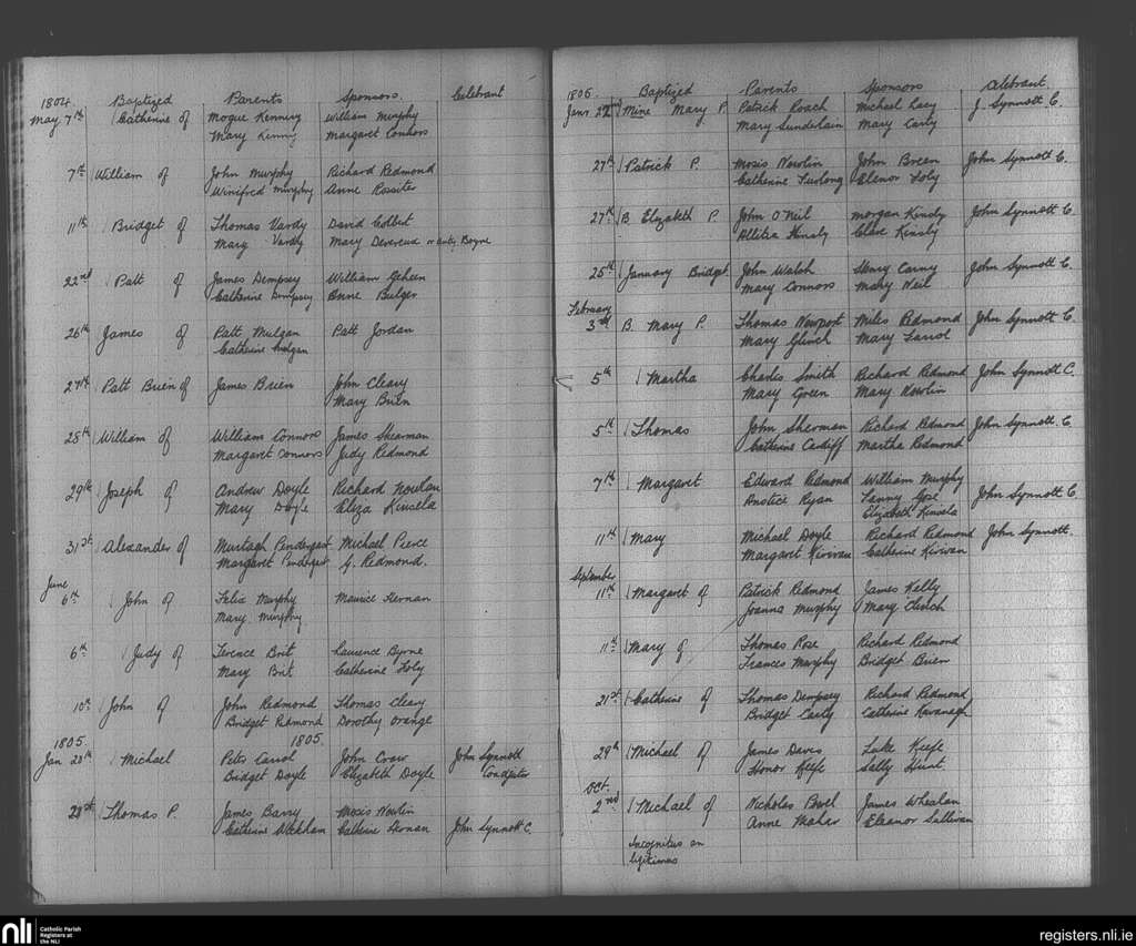 Enniscorthy; County of Wexford; Diocese of Ferns. Baptisms, May 1804 to Oct. 1805