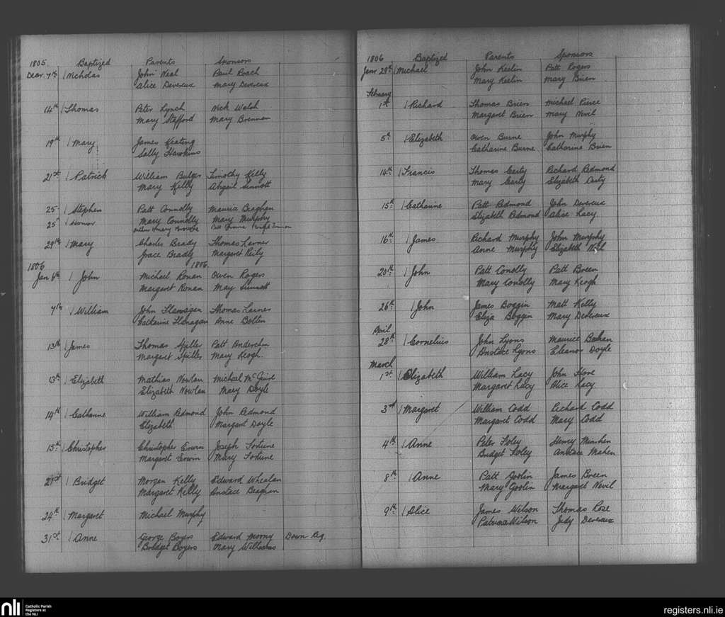 Enniscorthy; County of Wexford; Diocese of Ferns. Baptisms, Dec. 1805 to Mar. 1806