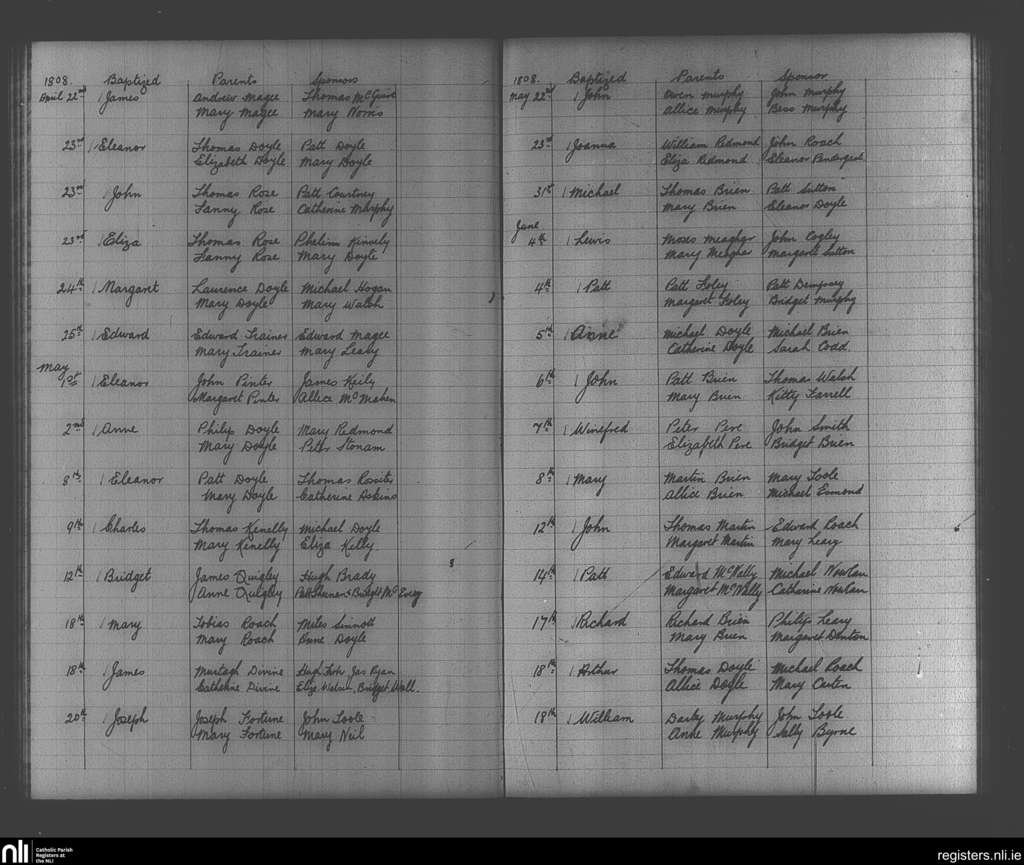 Enniscorthy; County of Wexford; Diocese of Ferns. Baptisms, Apr. 1808 to June 1808