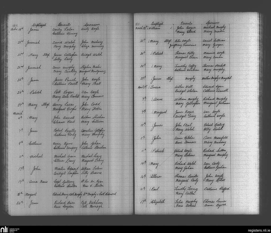 Enniscorthy; County of Wexford; Diocese of Ferns. Baptisms, Feb. 1811 to Apr. 1811