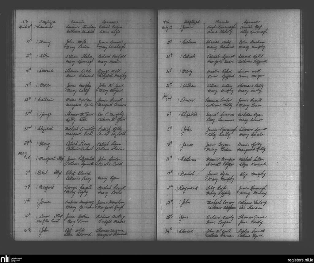 Enniscorthy; County of Wexford; Diocese of Ferns. Baptisms, Apr. 1816 to June 1816