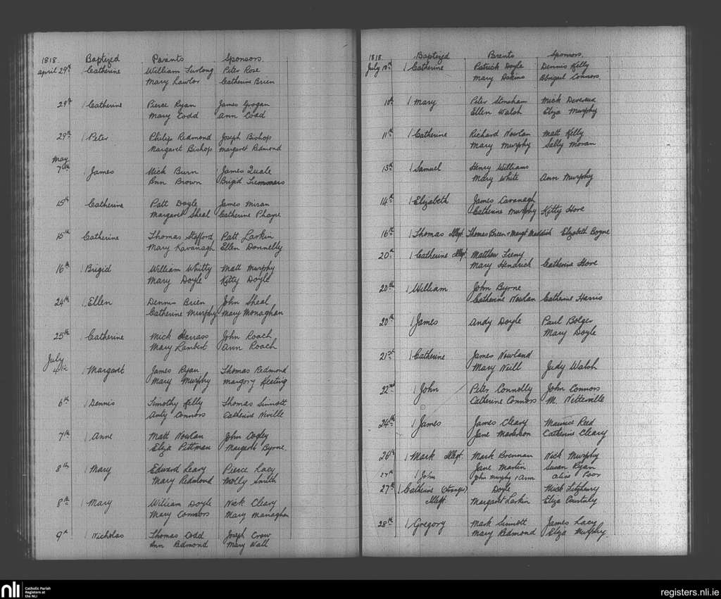 Enniscorthy; County of Wexford; Diocese of Ferns. Baptisms, Apr. 1818 to July 1818