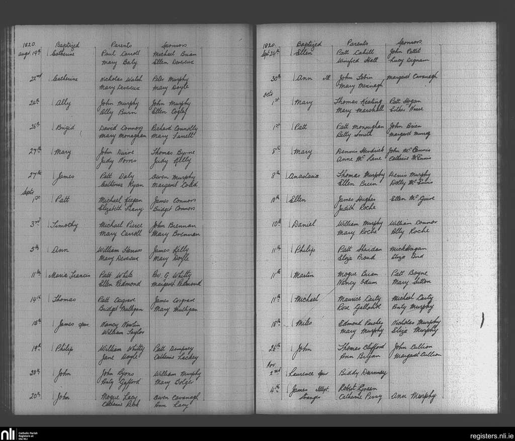 Enniscorthy; County of Wexford; Diocese of Ferns. Baptisms, Aug. 1820 to Oct. 1820