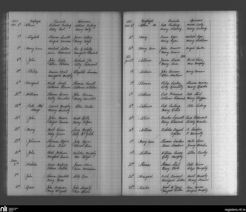 Enniscorthy; County of Wexford; Diocese of Ferns. Baptisms, Nov. 1820 to Jan. 1821