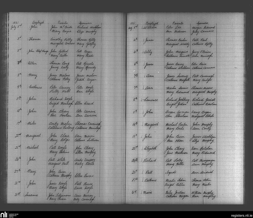 Enniscorthy; County of Wexford; Diocese of Ferns. Baptisms, July 1821 to Aug. 1821