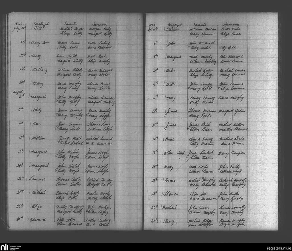 Enniscorthy; County of Wexford; Diocese of Ferns. Baptisms, July 1822 to Sep. 1822