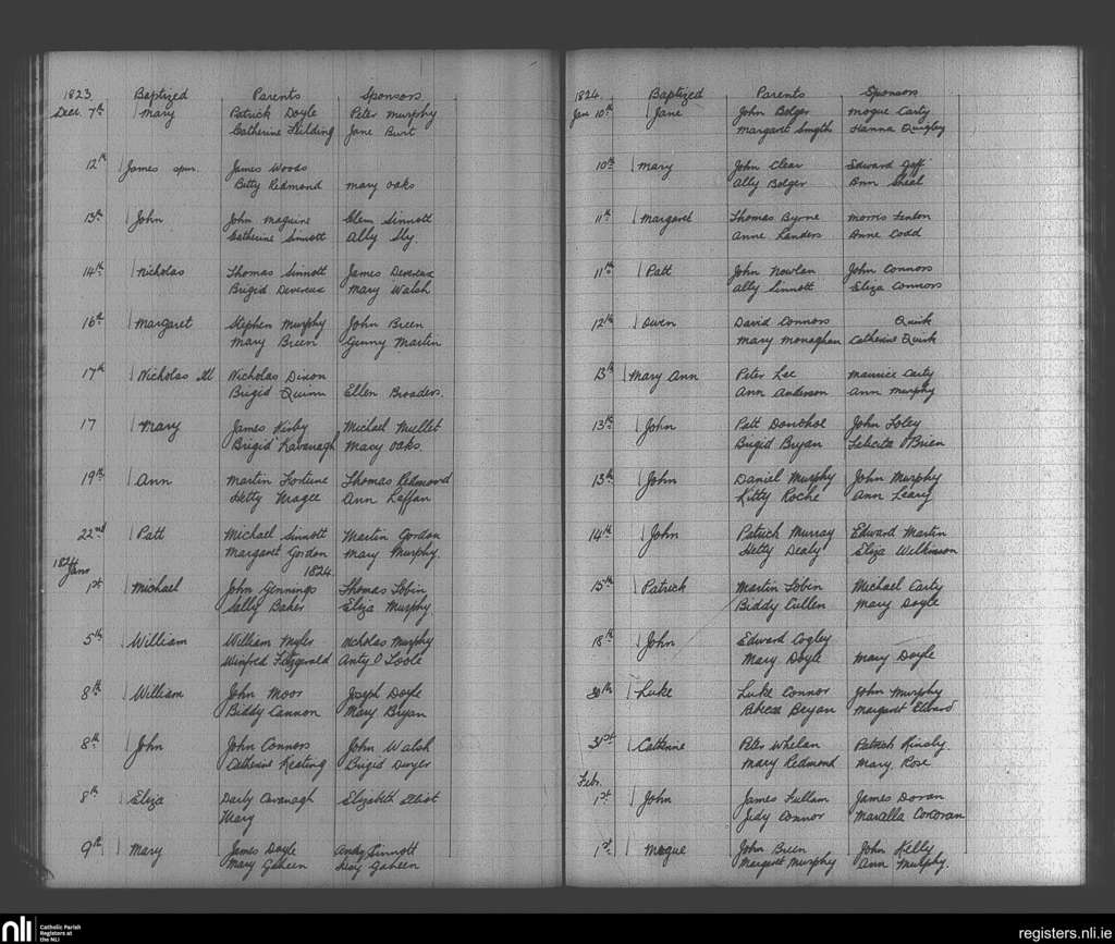 Enniscorthy; County of Wexford; Diocese of Ferns. Baptisms, Dec. 1823 to Feb. 1824
