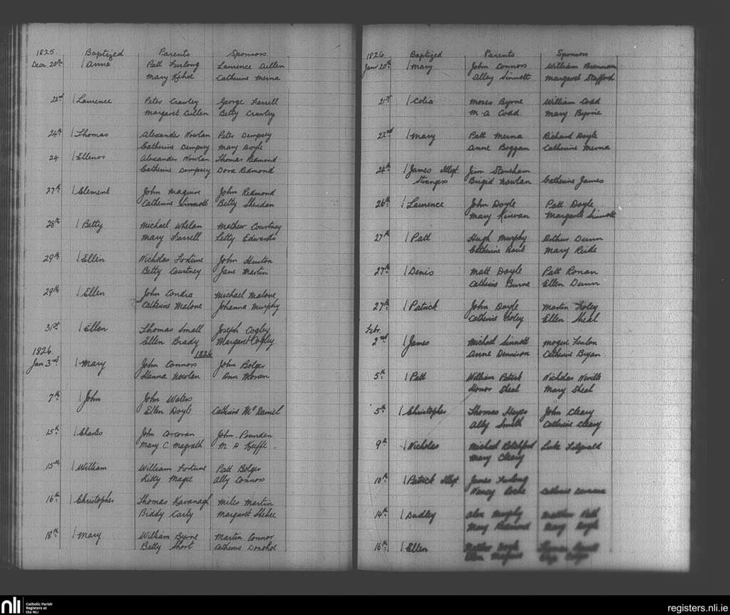 Enniscorthy; County of Wexford; Diocese of Ferns. Baptisms, Dec. 1825 to Feb. 1826