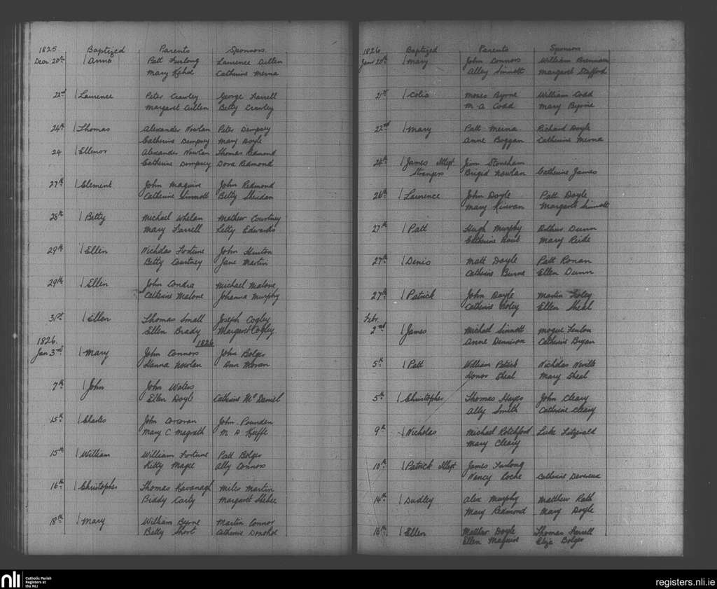 Enniscorthy; County of Wexford; Diocese of Ferns. Baptisms, Dec. 1825 to Feb. 1826