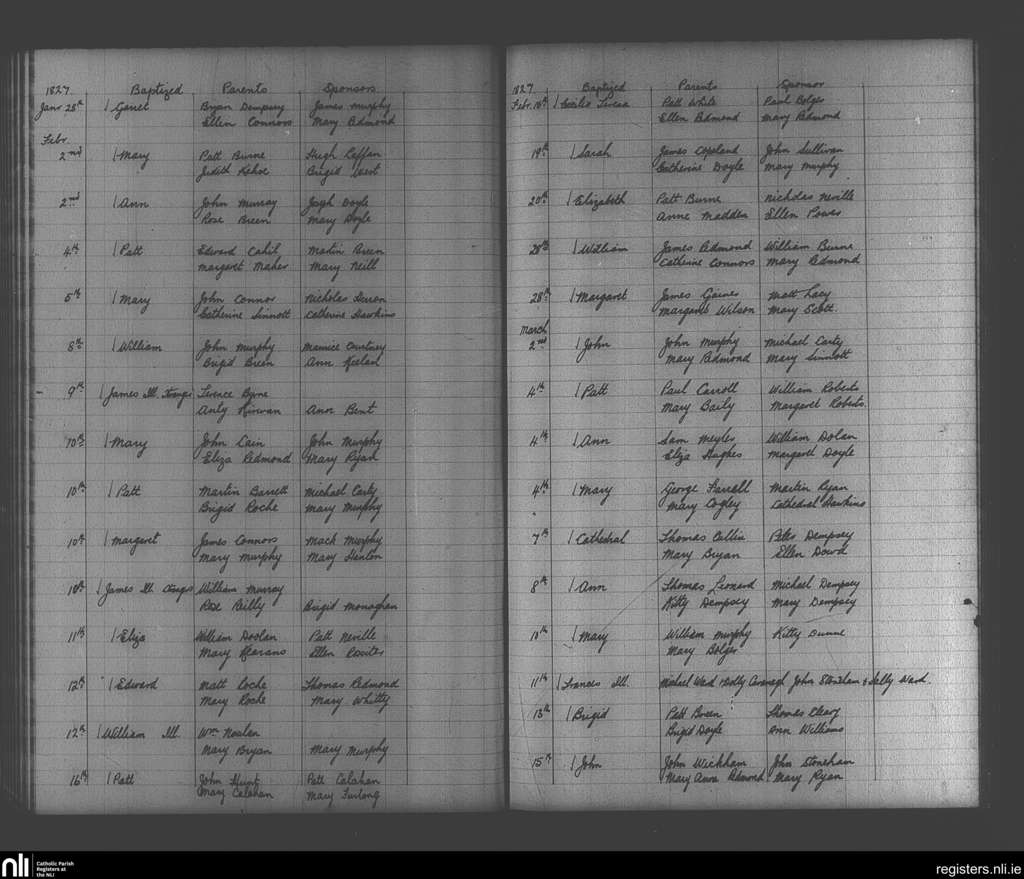 Enniscorthy; County of Wexford; Diocese of Ferns. Baptisms, Jan. 1827 to Mar. 1827