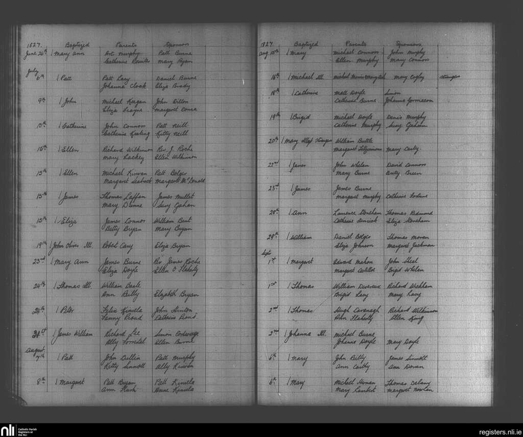 Enniscorthy; County of Wexford; Diocese of Ferns. Baptisms, June 1827 to Sep. 1827
