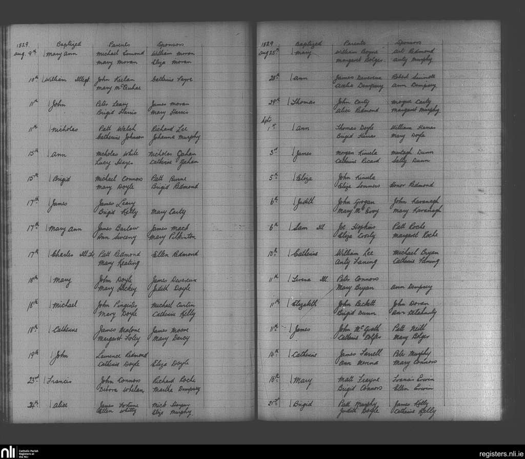 Enniscorthy; County of Wexford; Diocese of Ferns. Baptisms, Aug. 1829 to Sep. 1829