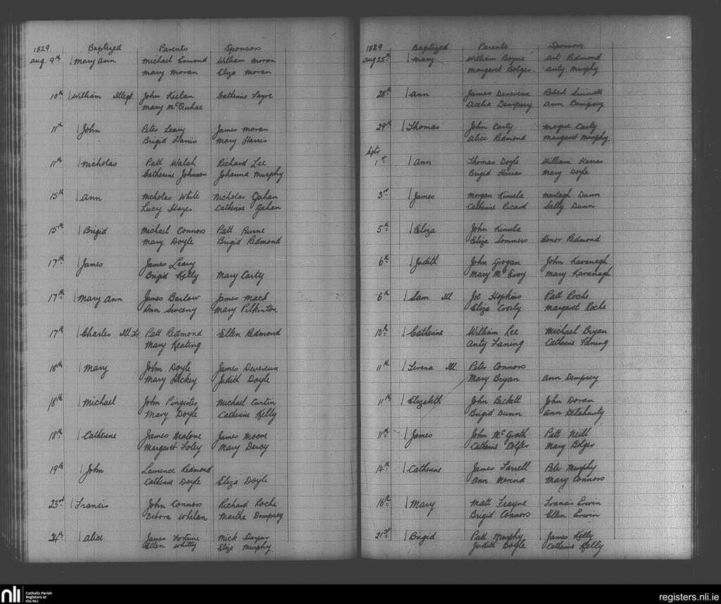 Enniscorthy; County of Wexford; Diocese of Ferns. Baptisms, Aug. 1829 to Sep. 1829