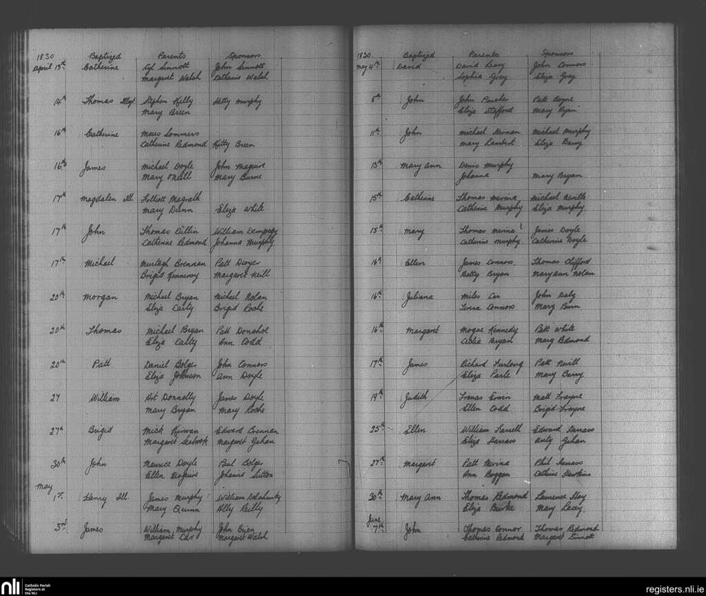 Enniscorthy; County of Wexford; Diocese of Ferns. Baptisms, Apr. 1830 to June 1830