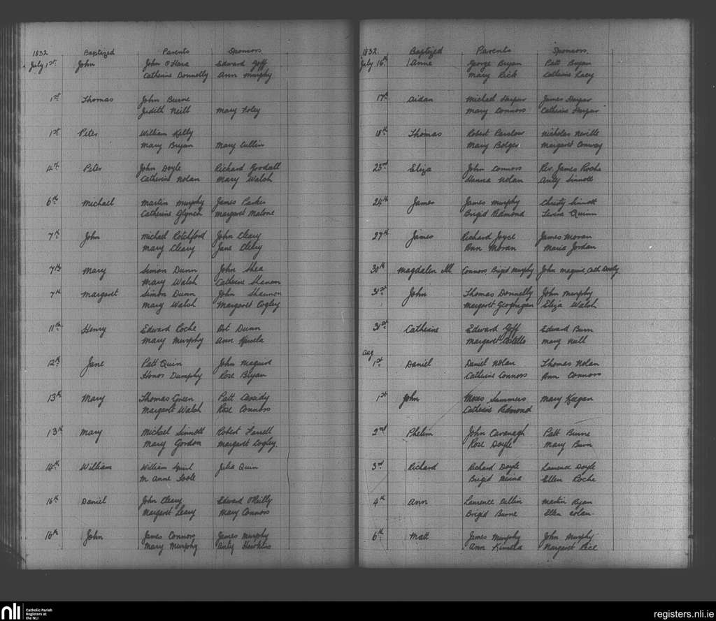 Enniscorthy; County of Wexford; Diocese of Ferns. Baptisms, July 1832 to Aug. 1832