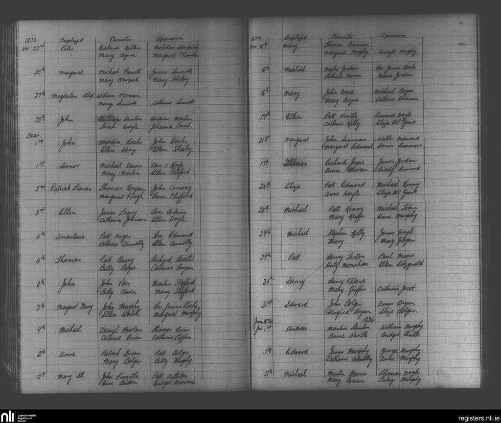 Enniscorthy; County of Wexford; Diocese of Ferns. Baptisms, Nov. 1833 to Jan. 1834