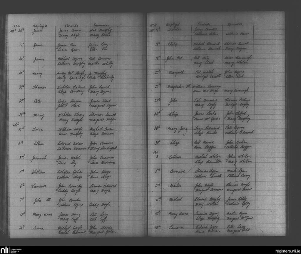 Enniscorthy; County of Wexford; Diocese of Ferns. Baptisms, Sep. 1834 to Nov. 1834
