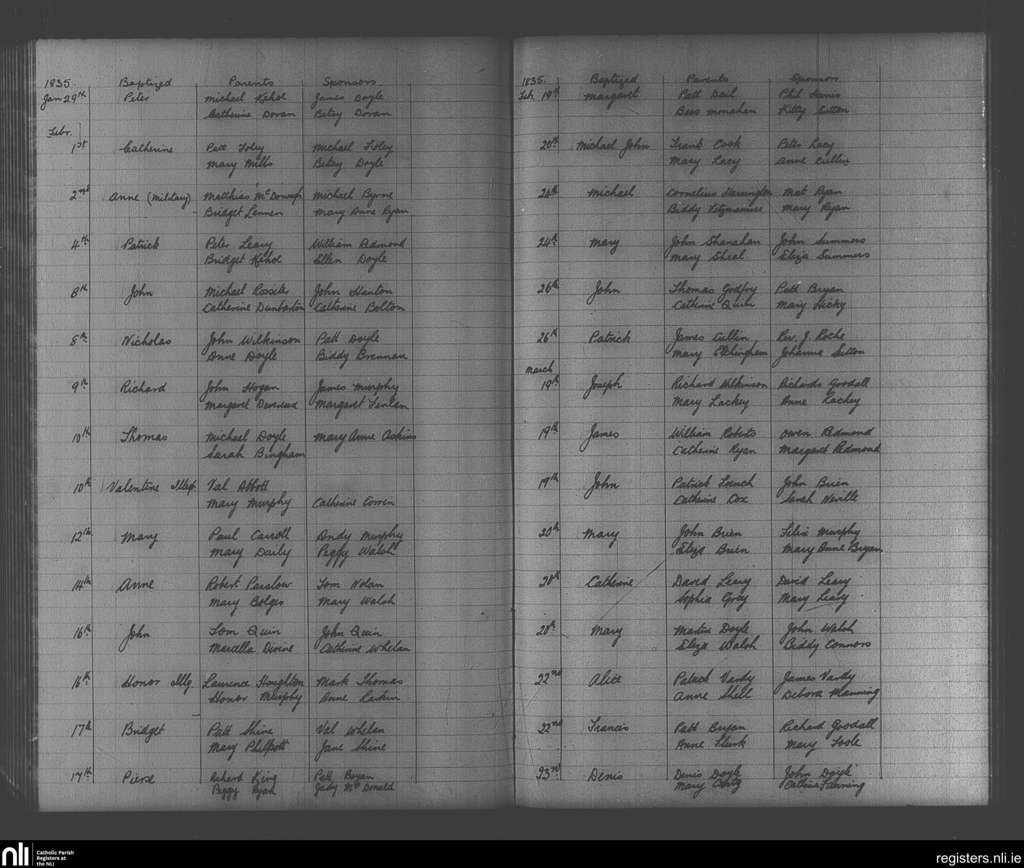 Enniscorthy; County of Wexford; Diocese of Ferns. Baptisms, Jan. 1835 to Mar. 1835