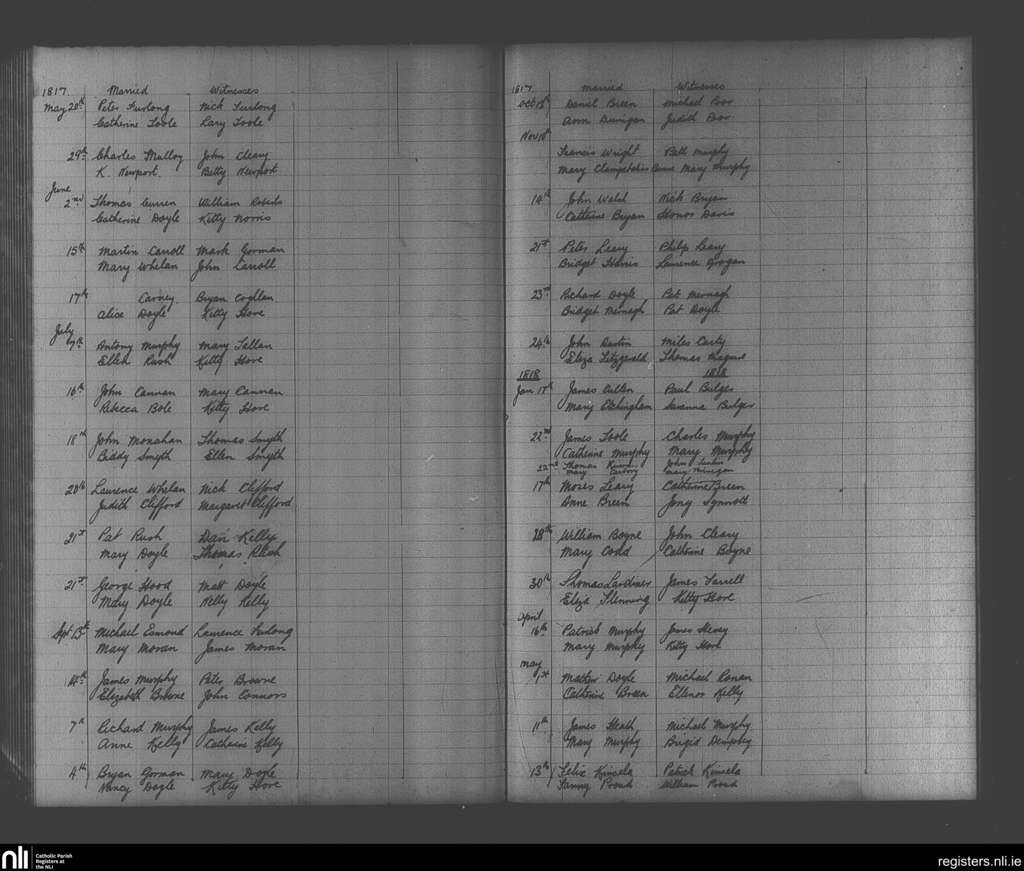 Enniscorthy; County of Wexford; Diocese of Ferns. Marriages, May 1817 to May 1818