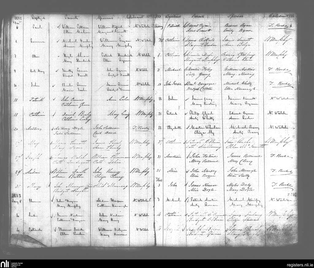 Enniscorthy; County of Wexford; Diocese of Ferns. Baptisms, Dec. 1852 to Feb. 1853