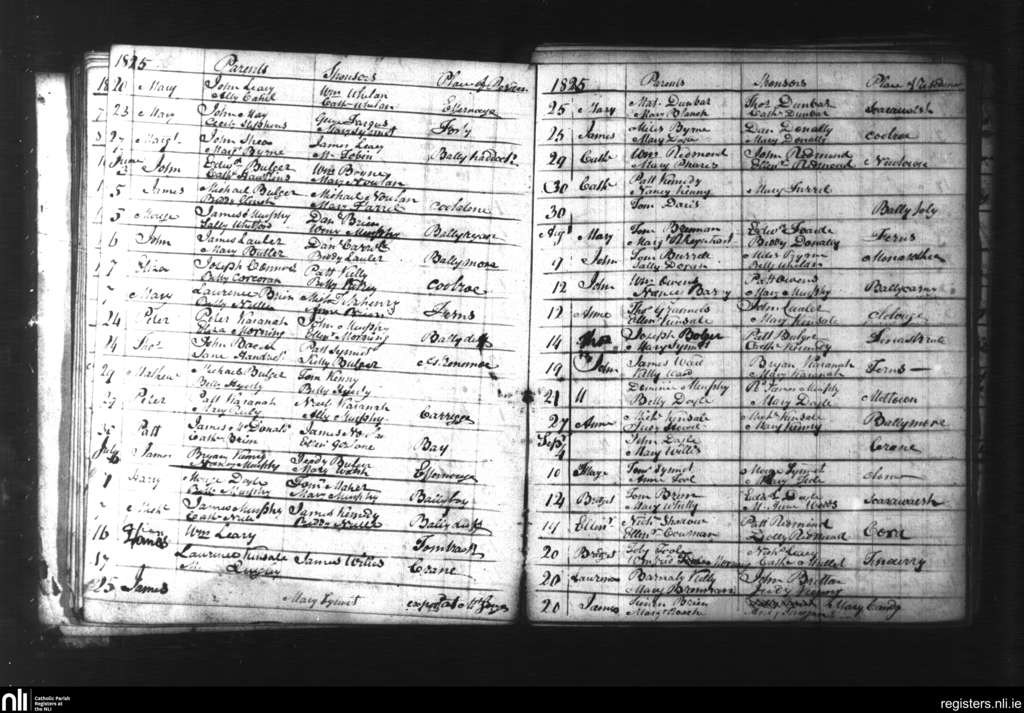 Ferns; County of Wexford; Diocese of Ferns. Baptisms, May 1825 to Sep. 1825