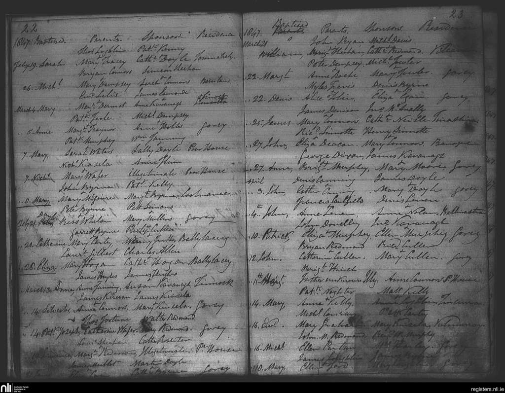 Gorey; County of Wexford; Diocese of Ferns. Baptisms, Feb. 1847 to Apr. 1847