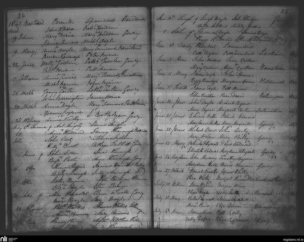 Gorey; County of Wexford; Diocese of Ferns. Baptisms, Apr. 1847 to July 1847