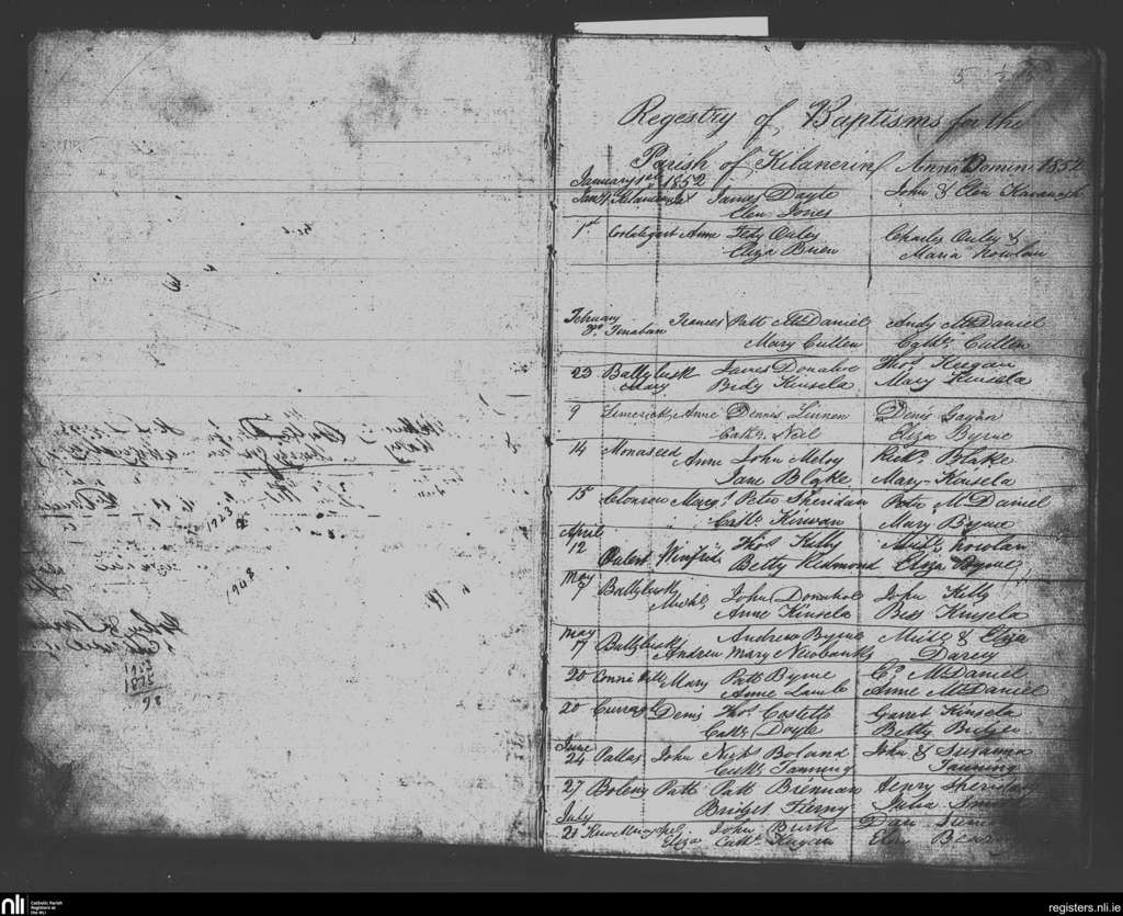 Killanerin; County of Wexford; Diocese of Ferns. Baptisms, Jan. 1852 to July 1852