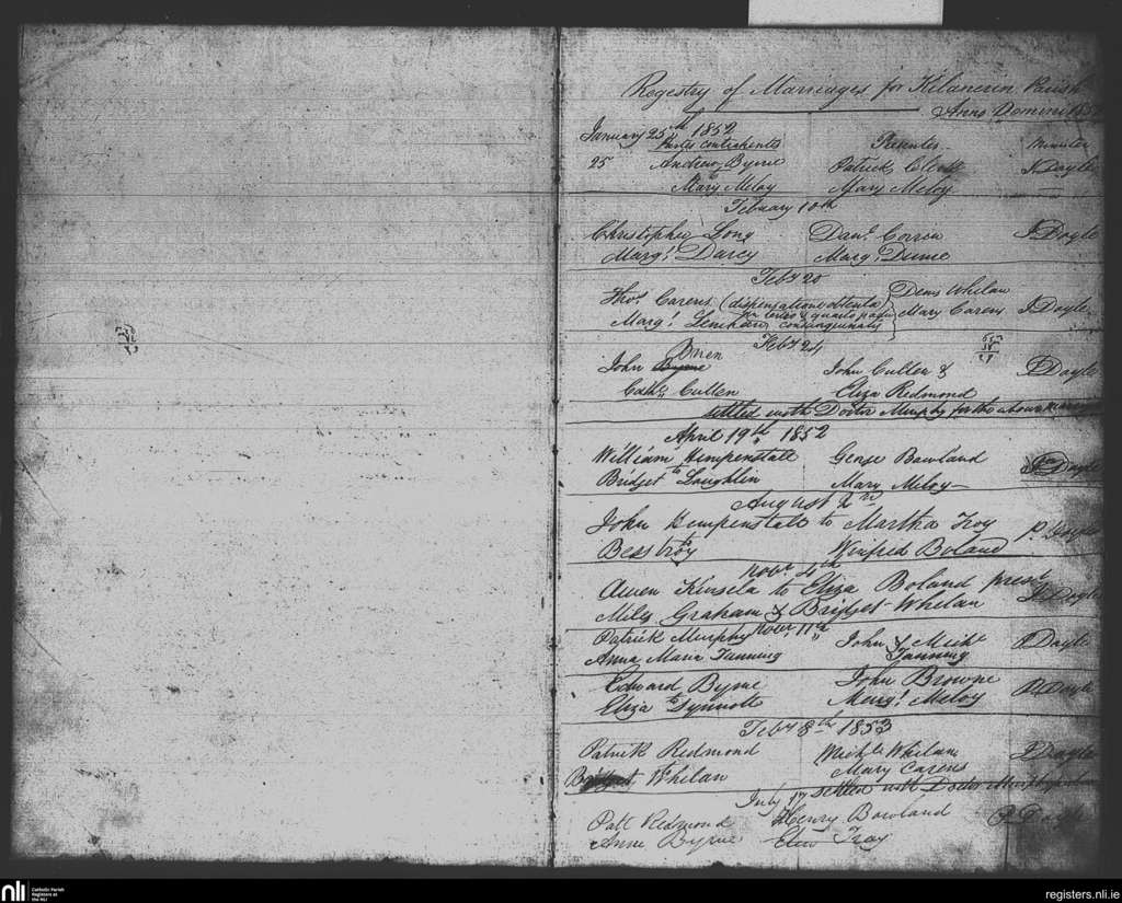 Killanerin; County of Wexford; Diocese of Ferns. Marriages, Jan. 1852 to July 1853