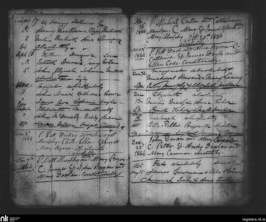 Marshalstown; County of Wexford; Diocese of Ferns. Baptisms, Sep. 1864 to Jan. 1865