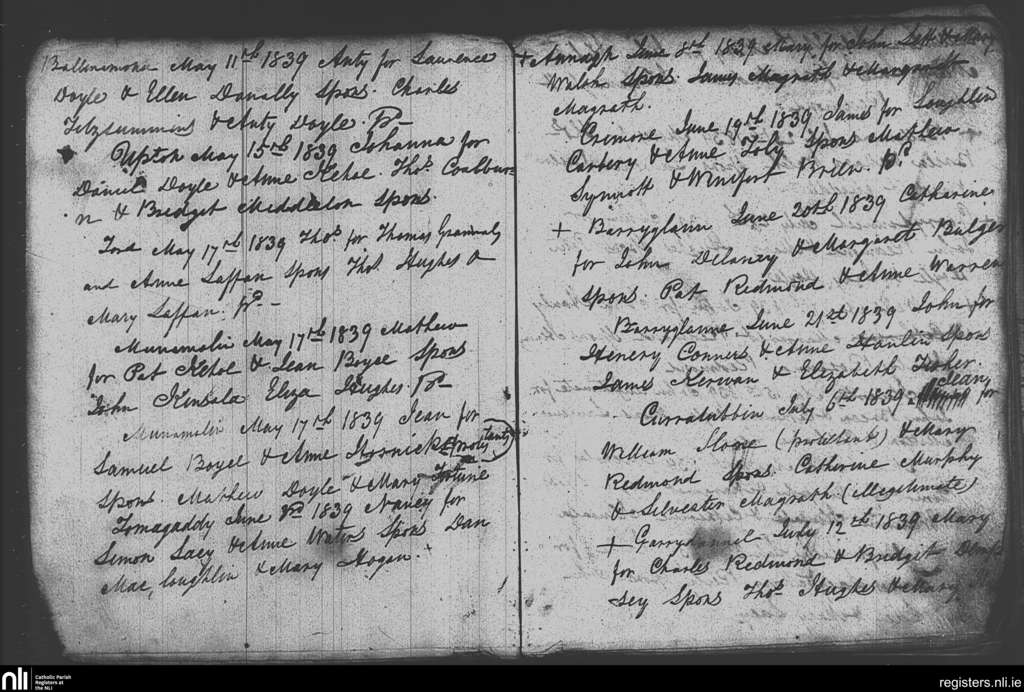 Monamolin; County of Wexford; Diocese of Ferns. Baptisms, May 1839 to July 1839