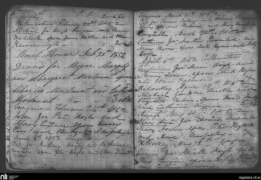 Monamolin; County of Wexford; Diocese of Ferns. Baptisms, Feb. 1852 to May 1852