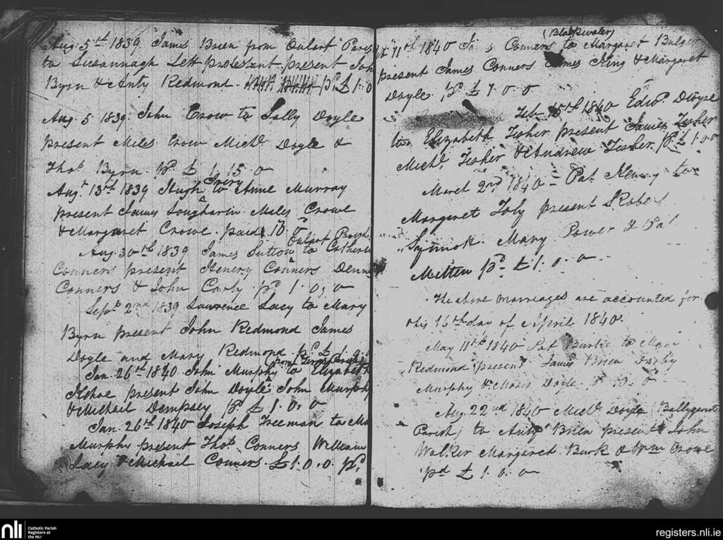 Monamolin; County of Wexford; Diocese of Ferns. Marriages, Aug. 1839 to Aug. 1840
