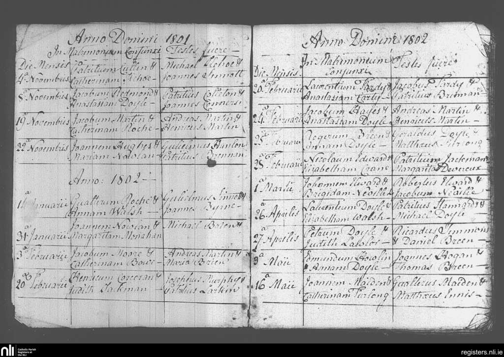Taghmon; County of Wexford; Diocese of Ferns. Marriages, Nov. 1801 to May 1802